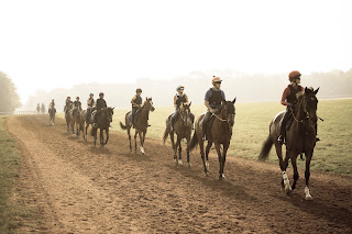 On the gallops at Newmarket’s Warren Hill, a group of four riders dressed in beige jackets and caps approach at a brisk canter, their horses’ hooves drumming and manes flying.